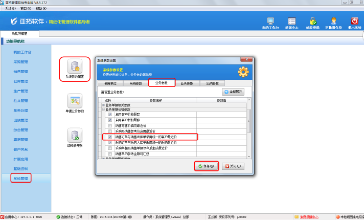 在功能導航窗點擊“系統管理”——》“系統參數配置”——》“業務參數”可以進入到“業務參數”配置界面,在業務單據價格參數內打勾啟用“銷售訂單與銷售出庫單采用統一的客戶最近價”參數,如下圖一所示。
