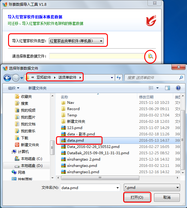 圖二 導入紅管家送貨單軟件(單機版)賬套數據文件