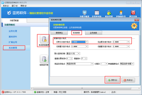 為滿足更多用戶可根據自身業務特點進行設置數據顯示格式的需求。亞拓管理軟件紅管家送貨單軟件支持數據項顯示格式的設置。以送貨單軟件為例,示范如何設置。登錄軟件,在功能導航窗點“系統管理”—》“系統參數設置”即可進入“系統參數設置”界面,點擊“系統參數”,如圖1所示: