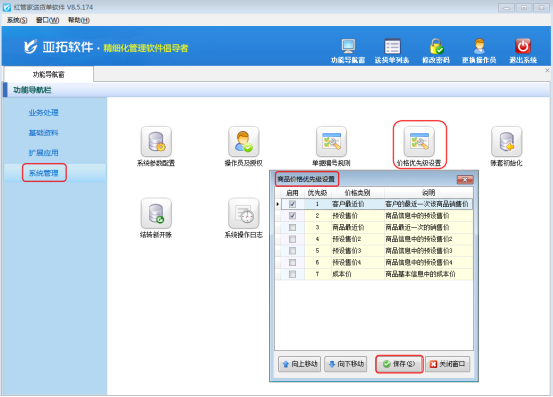 “價格優先級設置”窗口中打勾啟用表示生效,點擊“向上移動”和“向下移動”按鈕可以調整價格的優先順序,系統按上一個價格策略沒有獲取到價格時,會自動按下一個價格策略獲取價格。