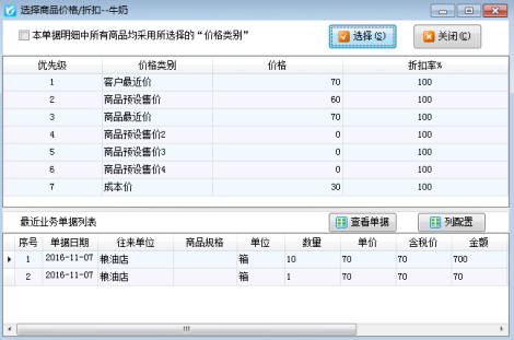 如果我們選擇新增加的商品,商品信息里輸入的有商品的預設售價,那么由于沒有該商品的客戶最近價,軟件會自動調取出商品的預設售價,我們可以在明細欄中點“選擇價格”查看不同類別的價格以及最近業務單據,如圖4所示。