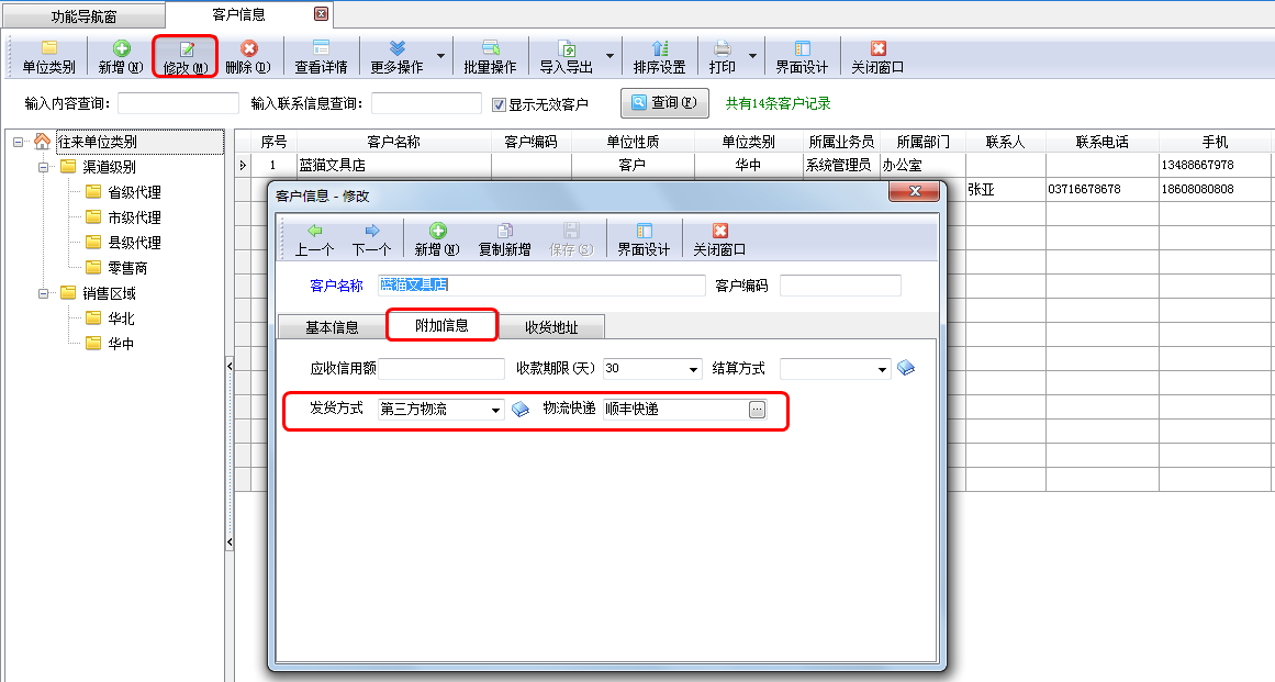 在功能導(dǎo)航窗點(diǎn)擊“基礎(chǔ)資料”—》“客戶信息”打開客戶信息維護(hù)界面,選擇其中一個(gè)客戶資料進(jìn)行修改,維護(hù)“發(fā)貨方式”為“第三方物流”且設(shè)置默認(rèn)物流快遞信息,如下圖一中所示,客戶“藍(lán)貓文具店”的默認(rèn)發(fā)貨物流快遞為“順豐快遞”。