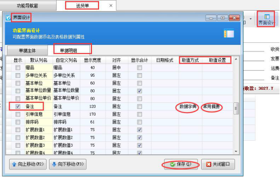 以送貨單軟件為例,示范下如何設置備注為選擇項,首先打開一個送貨單,打開工具欄中的“界面設計”選擇“單據明細”中的備注項。取值方式選擇“數據字典”,取值設置選擇“常用摘要”,然后保存設置,如下圖所示: