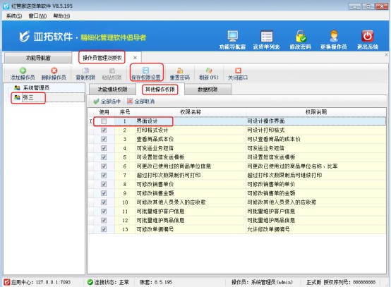 亞拓管理軟件、紅管家倉(cāng)庫(kù)管理軟件、紅管家出納記賬軟件及紅管家送貨單軟件內(nèi)都可以設(shè)置多個(gè)操作員并對(duì)操作員賬號(hào)設(shè)置權(quán)限,部分用戶不希望員工賬號(hào)可以隨便修改軟件界面格式,如何設(shè)置呢?本篇文章以紅管家送貨單軟件為例詳細(xì)介紹一下送貨單軟件內(nèi)如何設(shè)置操作員不可進(jìn)行軟件界面設(shè)計(jì)?