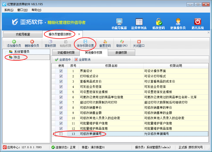 在功能導航窗點“系統管理”→“操作員及授權”即可進入“操作員管理及授權”界面,選中操作員賬號,在“其他操作權限”界面將“可修改單據編號”權限打鉤取消,如下圖一所示,設置操作員賬號“張亞”不可修改系統已生成的單據編號,設置完成后點擊“保存權限設置”按鈕保存設置。