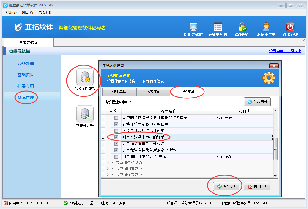 在功能導航窗點擊“系統管理”→“系統參數配置”→“業務參數”可以打開“業務參數”配置界面,在業務單據相關參數內打鉤啟用“引單可選擇未審核的訂單”參數,然后點擊“保存”按鈕保存設置,如下圖二所示。