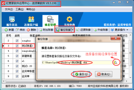 送貨單單機版更換電腦需要首先把原來的電腦做好備份工作,備份是在電腦的應(yīng)用中心(紅色圖標)上進行操作。備份時可以選擇備份的保存路徑,為了更清晰的看到備份數(shù)據(jù)方便拷貝,可以把備份路徑更改為桌面。具體操作如下圖1所示: