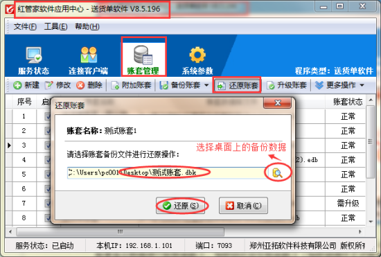 點擊“備份”后,賬套備份數(shù)據(jù)保存在桌面上,備份數(shù)據(jù)名字為“測試賬套.dbk”(可自己取名字),把這個賬套備份數(shù)據(jù)拷貝到新電腦上,加密鎖也放在新電腦上(加密鎖用于正式版本驗證),新電腦需要提前安裝好軟件,軟件安裝包可到亞拓軟件官網(wǎng)上下載(軟件下載地址),然后進行備份數(shù)據(jù)還原操作,還原操作也是在應(yīng)用中心上,點擊“還原賬套”選擇拷貝過來的賬套備份數(shù)據(jù):測試賬套.dbk,點擊還原后,數(shù)據(jù)就會恢復到新電腦上,如下圖2所示: