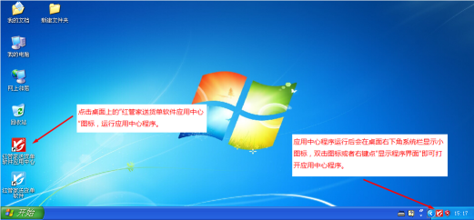 登陸時出現(xiàn)以上提示是因為應(yīng)用中心程序沒有運行導(dǎo)致,此時將應(yīng)用中心程序(紅色圖標(biāo))運行一下即可登陸,點擊桌面上的“紅管家送貨單軟件應(yīng)用中心”程序圖標(biāo)(或者在開始菜單中點擊程序組中的相應(yīng)功能),即可打開運行應(yīng)用中心程序。應(yīng)用中心程序運行后會在桌面右下角顯示應(yīng)用中心圖標(biāo),如下圖二所示。