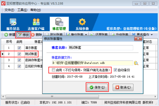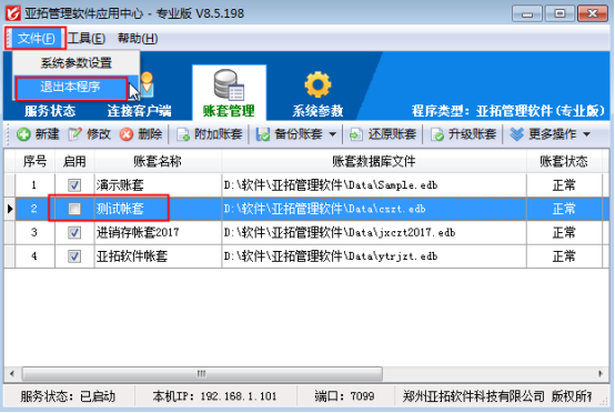 亞拓軟件旗下的亞拓管理軟件、紅管家倉庫管理軟件、紅管家送貨單軟件、紅管家出納記賬軟件、紅管家票據(jù)打印軟件等軟件新架構(gòu)程序安裝后會(huì)顯示兩個(gè)圖標(biāo),一個(gè)是應(yīng)用中心程序(紅色圖標(biāo)),一個(gè)是客戶端程序(藍(lán)色圖標(biāo))。這些軟件都含有賬套管理功能,在應(yīng)用中心里面可以建立多個(gè)賬套,已使用的帳套如果不再繼續(xù)使用,可以停用帳套,停用帳套后,客戶端程序登錄時(shí)無法連接該帳套。我們以亞拓管理軟件專業(yè)版為例演示一下如何停用帳套。