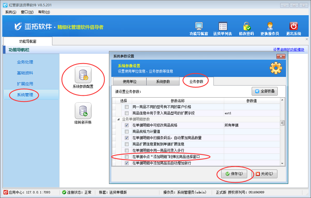 在功能導(dǎo)航窗點(diǎn)擊“系統(tǒng)管理”—》“系統(tǒng)參數(shù)配置”—》“業(yè)務(wù)參數(shù)”,即可進(jìn)入到“業(yè)務(wù)參數(shù)”配置界面,在業(yè)務(wù)單據(jù)明細(xì)參數(shù)內(nèi)找到“在單據(jù)中點(diǎn)擊‘添加明細(xì)’時(shí)彈出商品選擇窗口”參數(shù),把這個(gè)參數(shù)的勾選去掉,然后保存,如下圖二所示。