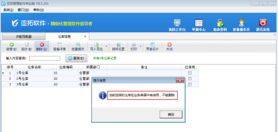 亞拓管理軟件和紅管家倉庫管理軟件都可以對倉庫信息進行管理,如果有些倉庫在單據中已被使用,系統默認在單據中已使用過的倉庫信息是不能刪除的(如圖1所示),因為如果刪除,則會影響之前已使用此倉庫信息所開的業務單據,對于此種情況,我們可以將需要刪除的倉庫置為停用,已停用的倉庫無法被用于開單。如何把不用的倉庫設置為停用呢?本篇文章以亞拓管理軟件專業版為例詳細介紹一下如何把倉庫設置為停用狀態。