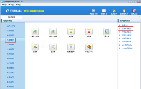亞拓管理軟件紅管家倉庫管理軟件都可以對倉庫信息進行管理,都可以查詢商品庫存數量倉庫庫存查詢可以查看存貨的實時庫存情況,包括庫存數量、可用庫存數量、待入庫數量、待出庫數量,并可查看庫存成本情況。支持按照倉庫、商品性質等條件進行匯總。本篇文章以亞拓管理軟件專業版為例詳細介紹一下如何查詢商品庫存數量
