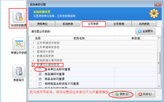 以亞拓管理軟件專業(yè)版為例,在系統(tǒng)管理—》系統(tǒng)參數(shù)配置—》業(yè)務(wù)參數(shù)中的“數(shù)據(jù)可重復(fù)參數(shù)”把“往來(lái)單位名稱可重復(fù)”的勾選符號(hào)取消,然后保存設(shè)置。如下圖所示: