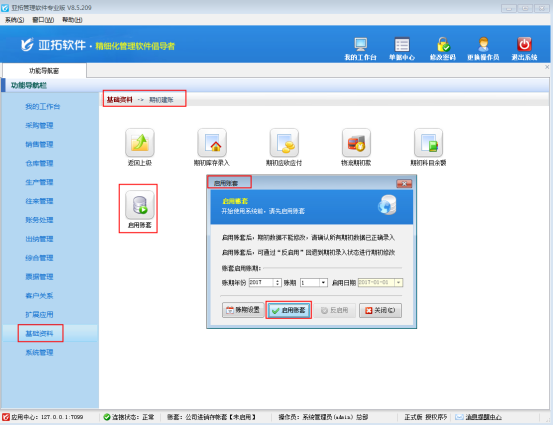 啟用賬期:是指準備從哪個月份開始使用軟件(例如:假設當前月份為2017年8月份,但我們想從2017年1月份開始使用軟件,可以將啟用賬期設置為2017年、賬期為1,這樣我們需要整理的期初數據就應該是截止到2017-01-01前的期初應收應付款、期初商品庫存,開賬后就可以錄入2017-01-01之后的業務單據)。