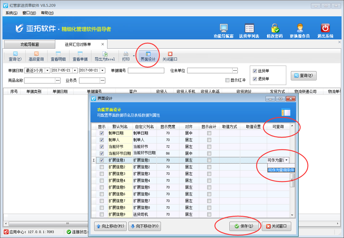 在“業務處理”界面右側相關統計查詢內選擇“送貨匯總對賬單”即可打開送貨匯總對賬單界面,點擊“界面設計”按鈕,在打開的界面設計窗口中找到“擴展信息1”,將其設置為可查詢條件,然后點擊“保存”按鈕即可保存設置,如下圖一所示。