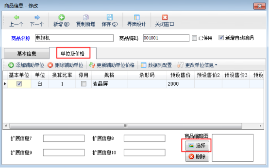 “商品信息修改”窗口點(diǎn)擊“單位及價(jià)格”,然后點(diǎn)擊“選擇”按鈕,可以選擇已準(zhǔn)備好的圖片,支持jpg、png等格式的圖片,建議圖片大小在100K以內(nèi),圖片大小過大會(huì)影響商品打開速度。選擇圖片后,點(diǎn)擊“保存”按鈕對(duì)商品信息保存,如圖2所示。如果需要更換商品圖片,可以點(diǎn)擊“刪除”按鈕刪除商品圖片,然后再從新上傳圖片即可。