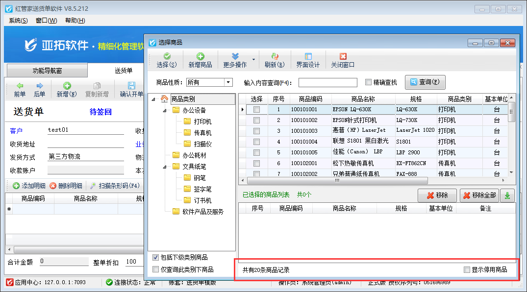 亞拓管理軟件、紅管家倉庫管理軟件和紅管家送貨單軟件開單時都支持選擇系統(tǒng)內(nèi)已錄入的商品信息,進(jìn)行快速選擇商品來開單。選擇商品時在選擇商品窗口默認(rèn)是可以顯示所有商品(圖一),但是部分用戶在選擇商品時只需要顯示此客戶相關(guān)的商品,如何設(shè)置呢?本篇文章我們以紅管家送貨單軟件為例來詳細(xì)介紹一下如何設(shè)置在選擇商品窗口僅顯示客戶相關(guān)商品?