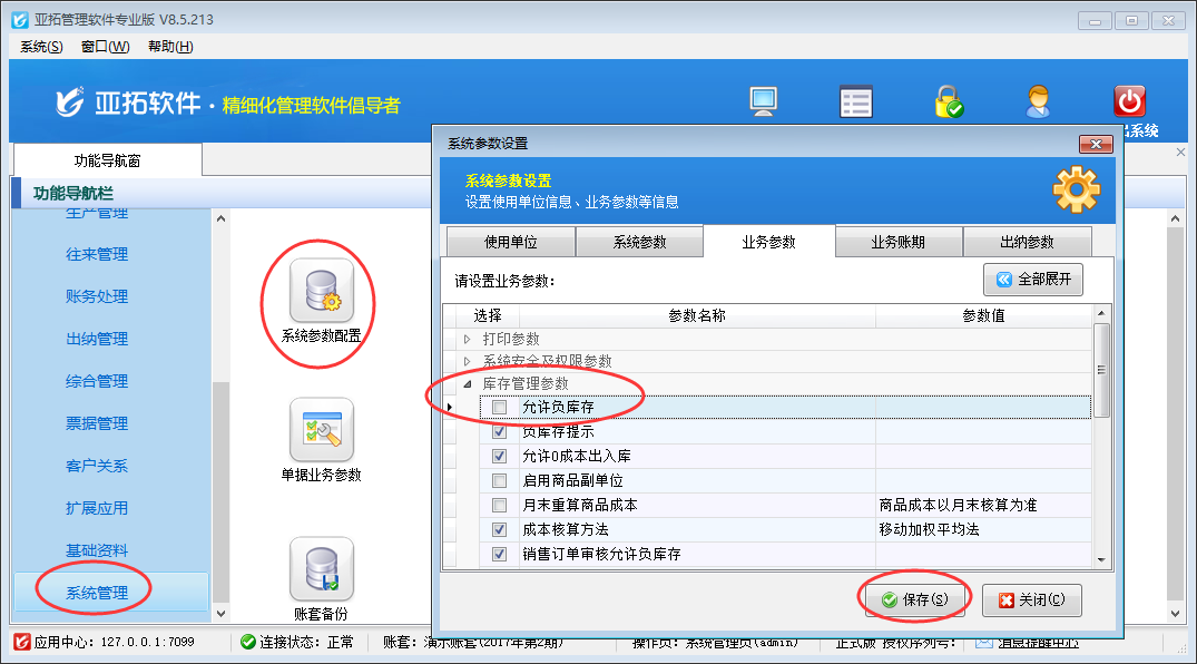 在功能導(dǎo)航窗點(diǎn)擊“系統(tǒng)管理”—》“系統(tǒng)參數(shù)配置”—》“業(yè)務(wù)參數(shù)”,即可進(jìn)入到“業(yè)務(wù)參數(shù)”配置界面,在庫存管理參數(shù)內(nèi)找到“允許負(fù)庫存”參數(shù),把這個(gè)參數(shù)的勾選去掉,然后保存,如下圖一所示。