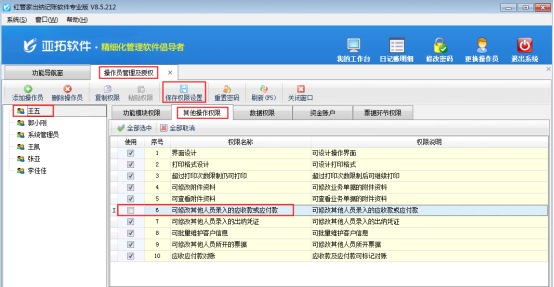 在功能導航窗點“系統管理”→“操作員及授權”即可進入“操作員管理及授權”界面,選中操作員賬號,在“其他操作權限”界面將“可修改其他人員錄入的應收款或應付款”權限打鉤取消,如下圖1所示,設置操作員賬號“王五”不可修改其他人員錄入的應收款或應付款。