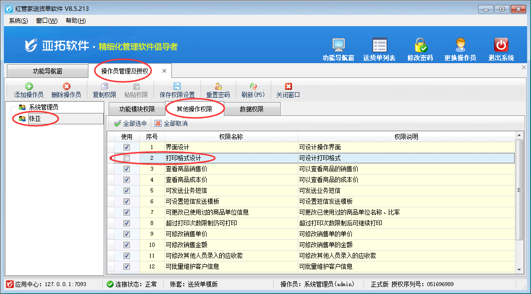 在功能導(dǎo)航窗點(diǎn)“系統(tǒng)管理”→“操作員及授權(quán)”即可進(jìn)入“操作員管理及授權(quán)”界面,選中操作員賬號(hào),在“其他操作權(quán)限”界面將“打印格式設(shè)計(jì)”權(quán)限打鉤取消,然后保存權(quán)限設(shè)置,如下圖一所示,設(shè)置操作員“張亞”沒(méi)有“打印格式設(shè)計(jì)”權(quán)限。