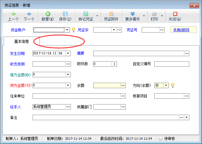 紅管家出納記賬軟件(標準版、專業版)在新增憑證時都支持錄入憑證明細,方便用戶錄入每個憑證的明細內容(系統默認沒有啟用憑證明細功能,如下圖所示),本篇文章我們以紅管家出納記賬軟件專業版為例來詳細介紹一下如何啟用憑證明細功能?