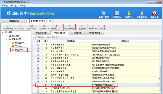 亞拓管理軟件和紅管家倉庫管理軟件都可以對銷售單列表、采購單列表、銷售訂單列表、采購訂單列表進行標記備注。紅管家送貨單軟件也可以對送貨單列表和退貨單列表進行標記備注。如果不允許操作員標記單據備注,可以對操作員取消“標記單據備注”的權限。下面我們介紹一下在亞拓管理軟件專業版中設置操作員不可標記單據備注的操作步驟。