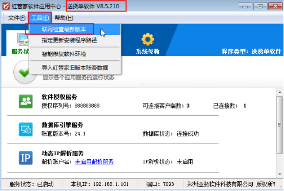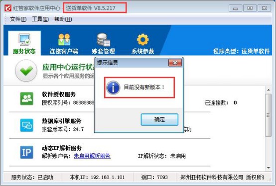 本文我們以紅管家送貨單軟件為例,截止到本文發布日期,紅管家送貨單軟件最新版是V8.5.217版本,我們以V8.5.210版本為例介紹下軟件聯網檢查最新版的兩種方法。