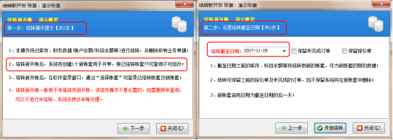 點(diǎn)擊“結(jié)轉(zhuǎn)新開賬”會彈出結(jié)轉(zhuǎn)新開賬界面,分成兩步操作,第一步:結(jié)轉(zhuǎn)操作提示;第二步:設(shè)置結(jié)轉(zhuǎn)截止日期。如下圖2所示: