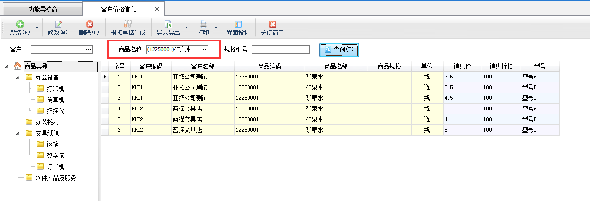 設置完成之后,在“基礎資料”——》“客戶價格信息”內,根據商品添加不同型號的不同客戶的銷售價格信息,如下圖二、圖三所示,設置“礦泉水—型號A”的“亞拓公司測試”銷售價為2.5元,“礦泉水—型號B”的“亞拓公司測試”銷售價為3.5元,“礦泉水—型號C”的“亞拓公司測試”銷售價為4.5元。