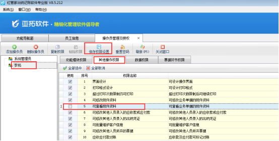 紅管家出納記賬軟件、亞拓管理軟件標(biāo)準(zhǔn)版、專業(yè)版支持日記賬導(dǎo)入憑證附件資料,更清晰的管理每筆日記賬的票據(jù)詳情信息。為避免每個人都查看到日記賬的詳細(xì)開票信息,軟件支持控制操作員的可查看憑證附件資料權(quán)限。