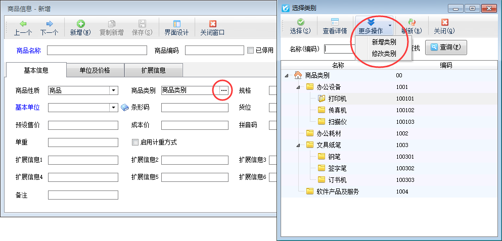 在新增商品窗口,如圖3所示,點擊“商品類別”后面的“...”選擇按鈕,系統彈出“選擇類別”窗口,在“選擇類別”窗口點擊“更多操作”可以進行新增、修改商品類別操作。