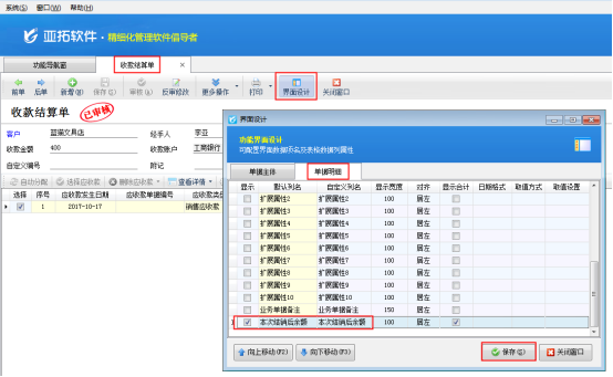 在功能導航窗點擊“往來管理”—》“收款結算單”即可打開“收款結算單列表”界面,然后打開一個收款結算單,如圖1所示,點擊“界面設計”,在系統彈出的界面設計窗口點擊“單據明細”,找到“本次結銷后余額”數據項,勾選此數據項后,點擊“保存”按鈕。