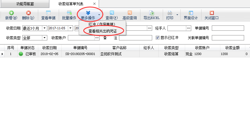 在功能導(dǎo)航窗點(diǎn)擊“往來管理”—》“收款結(jié)算單”即可打開收款結(jié)算單列表界面,然后通過工具欄內(nèi)“界面設(shè)計(jì)”功能可以將“出納憑證字”及“出納憑證號(hào)”數(shù)據(jù)項(xiàng)配置顯示出來,可以快速查看到收款結(jié)算單轉(zhuǎn)記的“出納憑證字”及“出納憑證號(hào)”,如下圖一所示。然后選中一個(gè)存在轉(zhuǎn)記出納憑證記錄的收款結(jié)算單,點(diǎn)擊工具欄中“更多操作”—》“查看相關(guān)出納憑證”按鈕(如圖二所示),即可快速打開相關(guān)出納憑證界面,查看相關(guān)出納憑證詳情(如下圖三所示)。