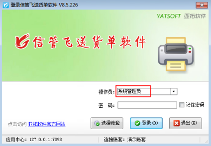 亞拓管理軟件、信管飛送貨單軟件、信管飛倉庫管理軟件、信管飛出納記賬軟件、信管飛票據打印軟件等安裝后默認登錄的操作員為“系統管理員”,如圖1、圖2所示。部分用戶在使用軟件時需要將“系統管理員”修改為自己的名字,在軟件內如何修改呢?本篇文章以信管飛送貨單軟件為例詳細介紹一下如何修改“系統管理員”名字?