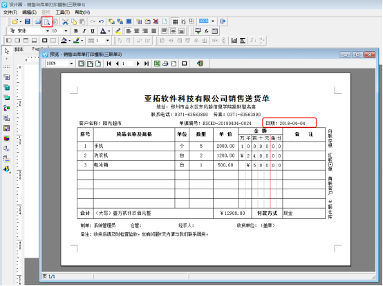 登錄軟件,開(kāi)一個(gè)送貨單單據(jù),打印預(yù)覽圖和單據(jù)界面如圖1所示,模板界面日期顯示的是“2018年04月04日”,下面我們把日期格式修改為“2018-04-04”顯示。