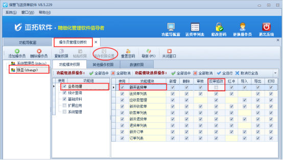 以送貨單軟件的送貨單單據(jù)為例,示范下如何設(shè)置操作員不能修改保存后的送貨單的權(quán)限。首先在功能導(dǎo)航窗選擇“系統(tǒng)管理”—》操作員及授權(quán),進(jìn)入操作員管理及授權(quán)界面。新增一個操作員“張亞”,選擇操作員張亞后,在右側(cè)的功能模塊權(quán)限,在業(yè)務(wù)處理—》新開送貨單權(quán)限中取消勾選“反審修改”權(quán)限。然后保存權(quán)限設(shè)置。如下圖1所示: