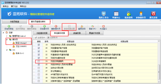 以亞拓管理軟件專業(yè)版為例,示范下如何設(shè)置操作員不能修改單據(jù)編號(hào)的權(quán)限。在功能導(dǎo)航窗選擇“系統(tǒng)管理”—》“操作員及授權(quán)”進(jìn)入操作員管理及授權(quán)界面。選擇操作員組的操作員“張亞”,點(diǎn)擊右側(cè)功能權(quán)限設(shè)置模塊,點(diǎn)擊“其他操作權(quán)限”,在下邊的權(quán)限中找到“可修改單據(jù)編號(hào)”,把勾選“√”符號(hào)取消(鼠標(biāo)單擊即可取消)。點(diǎn)擊保存權(quán)限設(shè)置。如下圖1所示: