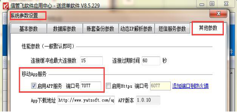 首先啟用電腦應(yīng)用中心中的移動(dòng)APP服務(wù),在應(yīng)用中心程序中選擇:系統(tǒng)參數(shù)—》其他參數(shù),勾選“啟用APP服務(wù)”,如下圖1所示: