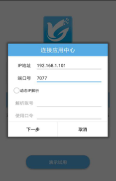 手機(jī)APP連接和主機(jī)電腦同一個(gè)網(wǎng)絡(luò),輸入主機(jī)電腦應(yīng)用中心程序的IP地址和啟用APP服務(wù)處的端口號(hào),進(jìn)行連接應(yīng)用中心上的賬套進(jìn)行登錄。手機(jī)APP安裝完成后,登錄界面點(diǎn)擊選擇賬套,輸入主機(jī)IP地址和端口號(hào)如下圖2、3所示: