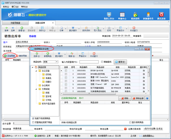 信管飛RMS、信管飛倉庫管理軟件、信管飛送貨單軟件等為了方便用戶可以快速開單,在單據中點擊“添加明細”按鈕默認都是彈出商品選擇窗口(如下圖一所示),可以快速選擇所需商品信息,但是部分用戶在開單時需要直接錄入新商品,而不是在商品信息庫中進行選擇,對于此種情況,軟件支持設置在單據中點擊“添加明細”按鈕時不彈出商品選擇窗口,本篇文章我們以信管飛RMS為例來詳細介紹一下如何設置在單據中點擊“添加明細”按鈕時不彈出商品選擇窗口?