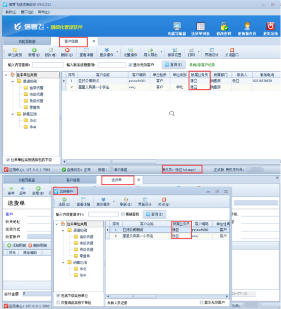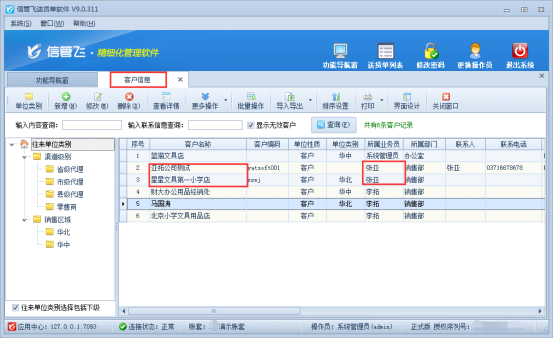 以“信管飛送貨單軟件”為例,示范下如何控制操作員僅能查看所屬為自己的客戶信息。首先需要在客戶信息中進(jìn)行整理下客戶的所屬業(yè)務(wù)員信息,如下圖1所示,示例以員工“張亞”為例。