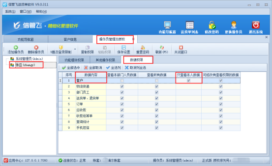 信管飛RMS軟件、信管飛倉庫管理軟件、信管飛送貨單軟件等都支持設(shè)置操作員權(quán)限,以控制操作員登錄軟件所顯示的功能,如公司需要限定操作員僅能查看和選擇自己所屬客戶信息,軟件中可以進(jìn)行控制。