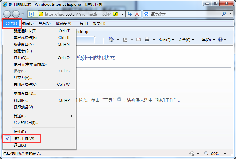 打開IE瀏覽器,在瀏覽器菜單欄點擊“文件”,然后在文件下拉列表中,可以看到“脫機工作”選項前面有一個“√”,說明當前是已開啟脫機工作模式,在此點擊將“脫機工作”取消即可。