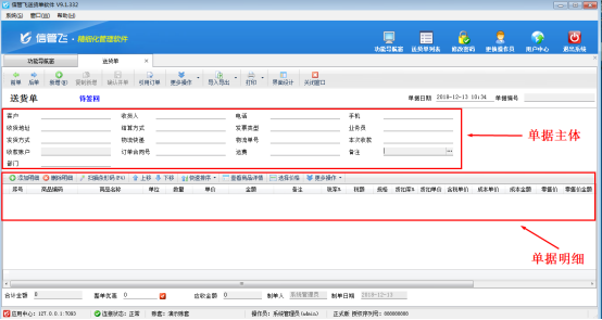 信管飛送貨單軟件業(yè)務(wù)單據(jù)的界面分為單據(jù)主體及單據(jù)明細(xì)兩部分,如圖1所示,單據(jù)默認(rèn)值功能是對單據(jù)主體的部分?jǐn)?shù)據(jù)項(xiàng)進(jìn)行設(shè)置默認(rèn)值,業(yè)務(wù)單據(jù)設(shè)置默認(rèn)值后,每次新增單據(jù)時會顯示已設(shè)置的數(shù)據(jù)項(xiàng)默認(rèn)值。
