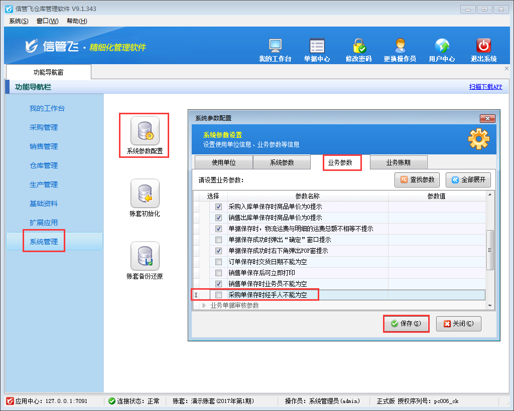 在功能導航窗中點擊“系統(tǒng)管理”—》“系統(tǒng)參數(shù)配置”,即可進入“系統(tǒng)參數(shù)設置”界面,點擊“業(yè)務參數(shù)”,如圖1所示,在業(yè)務單據(jù)保存參數(shù)內找到“采購單保存時經(jīng)手人不能為空”參數(shù),把這個參數(shù)的勾選去掉,然后保存。
