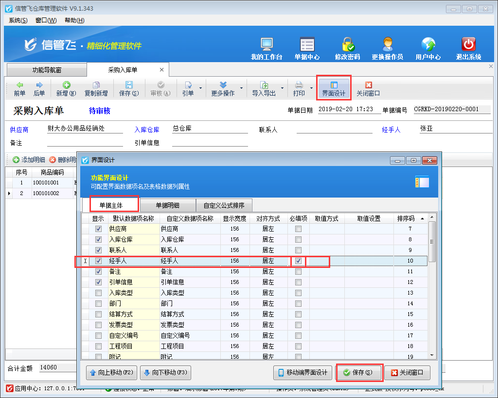 參數(shù)保存后,在功能導航窗點擊“采購管理”—》“采購入庫單”,新增采購入庫單,如果未輸入經(jīng)手人保存單據(jù)時仍提示“數(shù)據(jù)項[經(jīng)手人]不能為空,請輸入!”,可檢查下開單界面的“界面設計—》單據(jù)主體”中經(jīng)手人數(shù)據(jù)項是否勾選為必填項,如勾選可取消勾選保存配置,如下圖2所示: