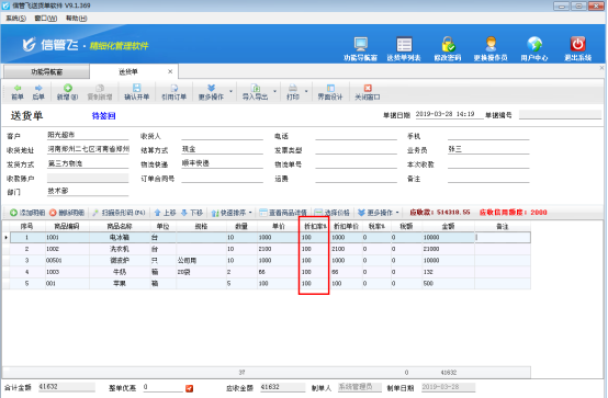 信管飛送貨單軟件、信管飛倉庫管理軟件、信管飛RMS開單時,當商品存在打折情況時,支持錄入商品的折扣率。當商品明細的內容比較多時,為了快速開單,提高效率,可以批量更新單據明細中的折扣率。
