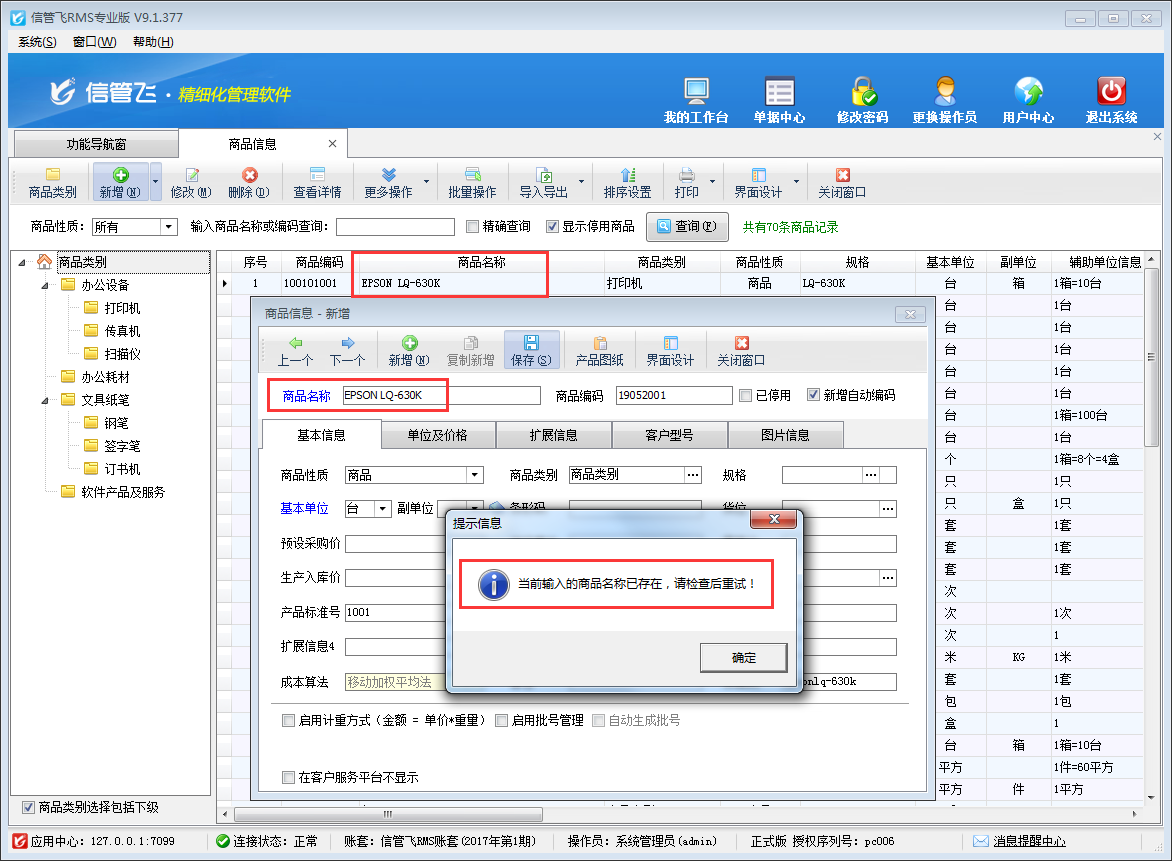 設置完成后,打開功能導航窗的“基礎資料”—》“商品信息”,新增一個商品,輸入和之前已有商品一樣的名稱,保存時系統會提示“當前輸入的商品名稱已存在,請檢查后重試!”,如下圖所示: