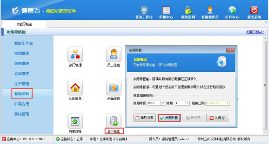 在賬套未啟用(開賬)之前是無法錄入業務單據的,只能錄入基礎資料(員工信息、供應商信息、客戶信息、商品信息、倉庫信息等)和期初數據(期初庫存單),在完成期初數據錄入后,就可以啟用賬套(即開賬),在功能導航窗點“基礎資料”—》“啟用賬套”,然后點“啟用賬套”,即可進行期初開賬操作:啟用賬期:是指準備從哪個月份開始使用軟件(舉例:假設當前月份為2019年6月份,但我們想從2019年1月份開始使用軟件,可以將啟用賬期設置為2018年、賬期為1,這樣我們需要整理的期初數據就應該是截止到2019-01-01前的期初商品庫存,開賬后就可以錄入2019-01-01之后的業務單據)。